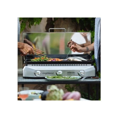 Cette plancha sera parfaite pour vos moments conviviaux grâce à sa surface de cuisson extra large qui peut accueillir jusqu’a 16 convives. Cuisiner vos aliments devient facile grâce à la Technologie Blue Flame composée de 9 rampes de brûleurs microflammes pour une parfaite répartition de la chaleur. En plus, le couvercle fermé permet de gagner du temps lors la montée en température. Elle permet également de protéger la surface de cuisson lorsque la plancha n’est pas utilisée. Elle est équipée d’un récipient à graisse pour récupérer les jus, facile d’accès et lavables au lave-vaisselle.