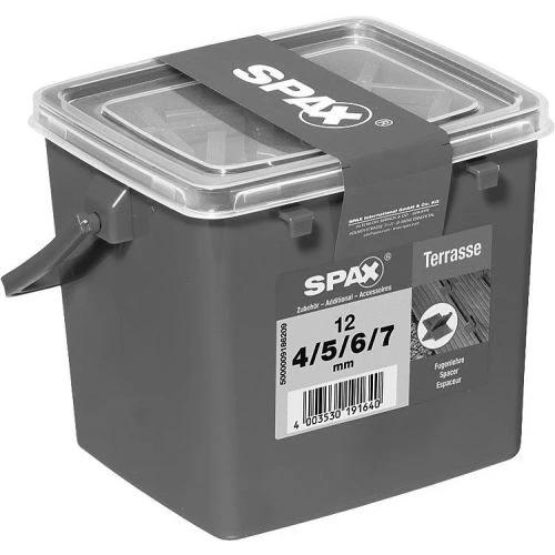 Les espaceurs en seau plastique de 12 pièces de la marque Spax sont destinés à la construction de terrasses et sont réutilisables à 4 dimensions d’écartement : 4 – 5 – 6 – 7 mm.
