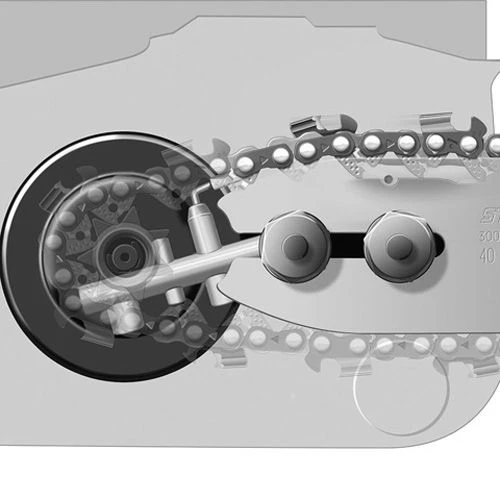 Avec le tendeur de chaîne rapide Stihl breveté, la chaîne peut être tendue sans outil, uniquement avec une molette de réglage, après avoir desserré le capot du pignon de chaîne.